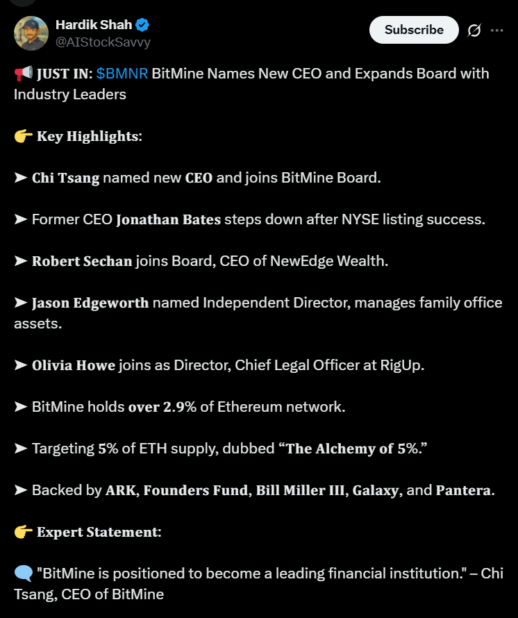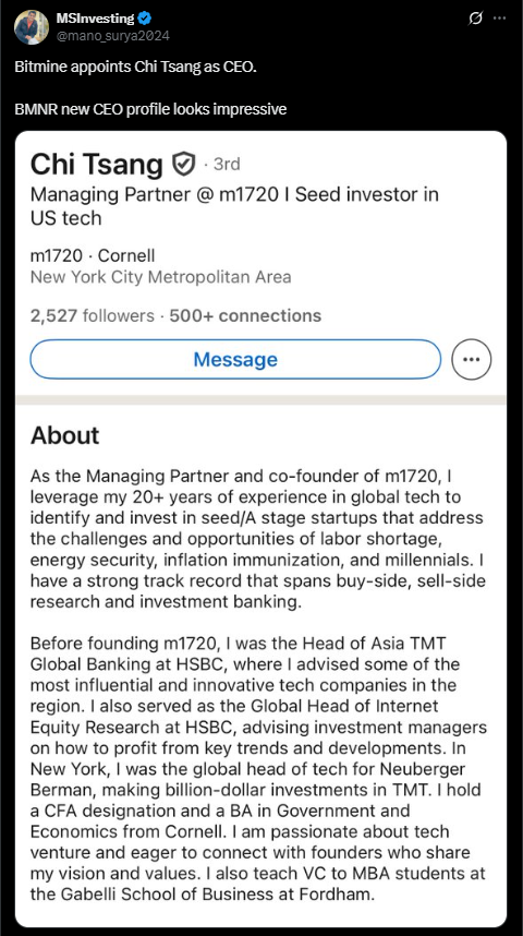 • BitMine Immersion named Chi Tsang as its new CEO, replacing longtime leader Jonathan Bates.