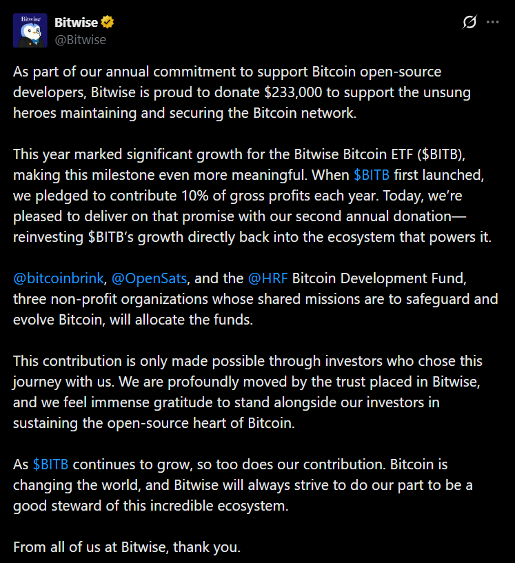 Bitwise Asset Management has announced a $233,000 donation to organizations supporting open-source Bitcoin developers. The funding comes directly from profits generated by the firm’s spot Bitcoin exchange-traded fund, BITB.