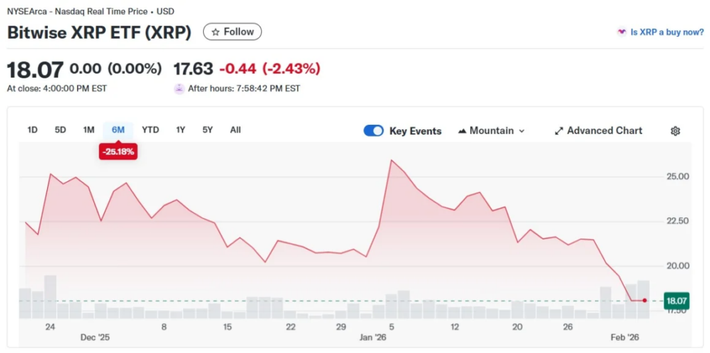 The Bitwise XRP ETF launched at $24.15 and climbed to a high of $26.88 shortly after going live. Momentum didn’t last. As broader crypto sentiment weakened heading into 2026, the ETF began sliding alongside the underlying asset. Market uncertainty, rising trade tensions, and tariff-related concerns added pressure across risk assets.