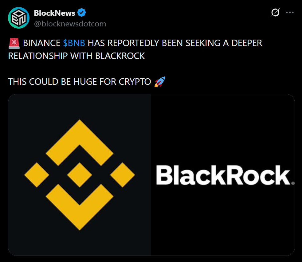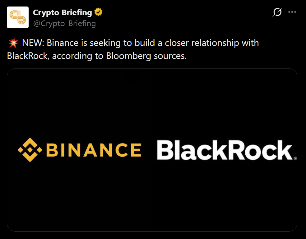 - BlackRock and Binance are reportedly discussing deeper financial cooperation.