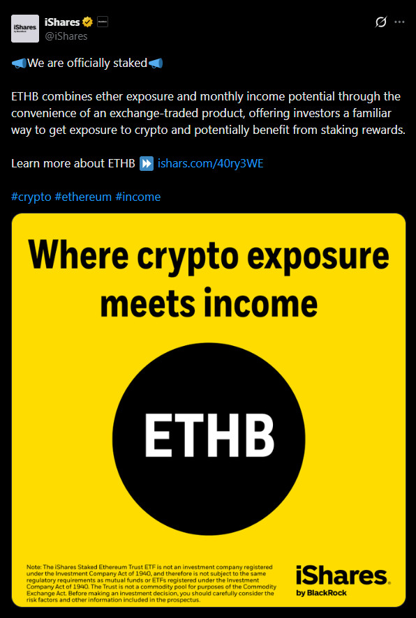 - BlackRock introduces ETHB, combining spot ETH exposure with staking income