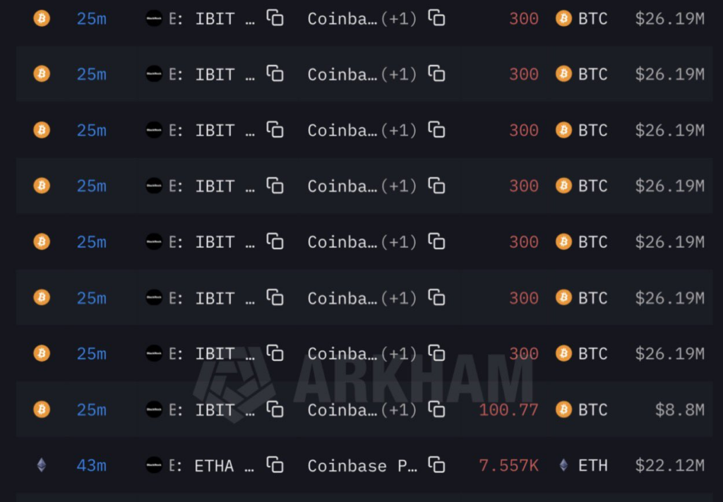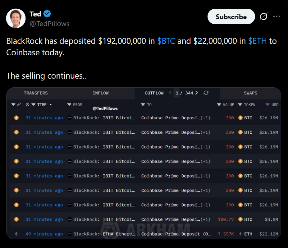According to data from Arkham Intelligence, BlackRock deposited more than 2,200 Bitcoin, valued at roughly $192 million, alongside around $22 million worth of Ethereum to Coinbase Prime. These transfers were recorded earlier today and come during a period of increased ETF redemptions.