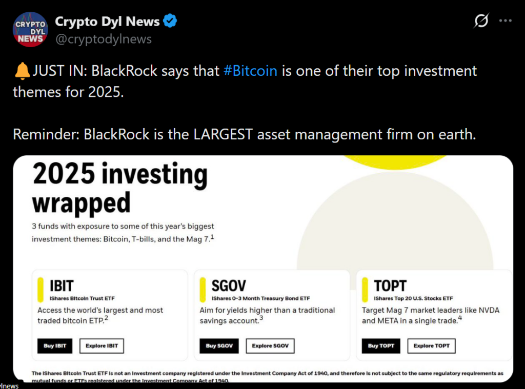 - BlackRock listed its Bitcoin ETF, IBIT, as a top investment theme for 2025.