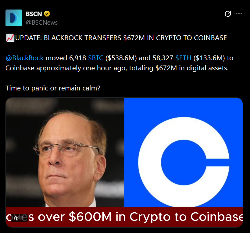 BlackRock’s $670 million transfer is not a sell signal by itself. It’s a reminder that ETFs make institutional behavior more transparent, especially when volatility spikes. The real story is ETF outflows and risk reduction, not panic liquidation — and that distinction matters as markets try to find footing.