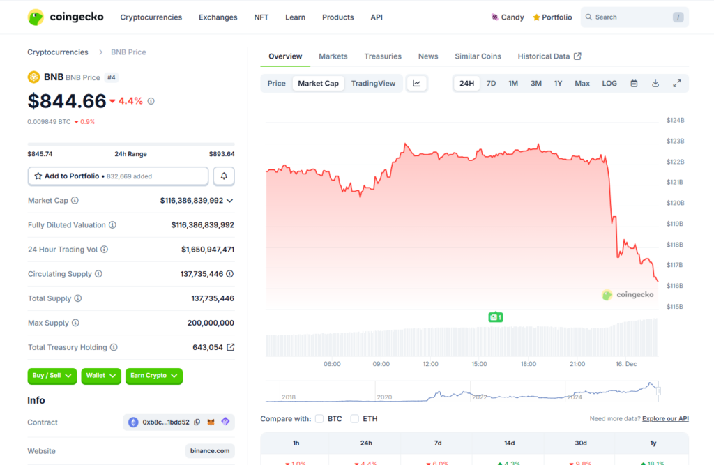The pullback appears largely technical rather than driven by any BNB-specific news. As the wider crypto market turned lower, Bitcoin and Ether posted 24-hour declines of roughly 2.8% and 3.6%, dragging sentiment down across major assets. BNB followed suit, slipping alongside the broader market as risk appetite cooled.