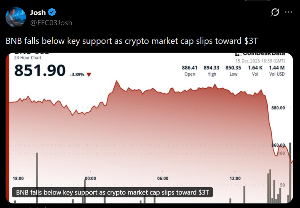 - Broader market weakness pulled BNB lower alongside BTC and ETH