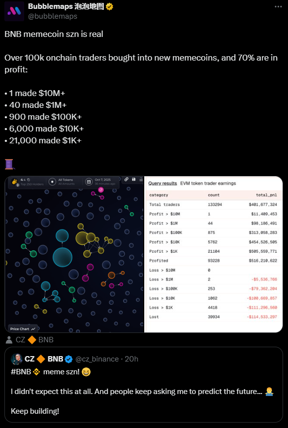 BNB Chain has emerged as the new epicenter of meme speculation, with over 100,000 new traders piling in during the past 48 hours. Bubblemaps data shows 70% of participants are in profit, with 40 wallets now holding million-dollar gains and one whale securing more than $10 million. Liquidity is rotating at lightning speed, with newly launched tokens racking up tens of millions in volume within a single day as BNB itself rallies to record highs.