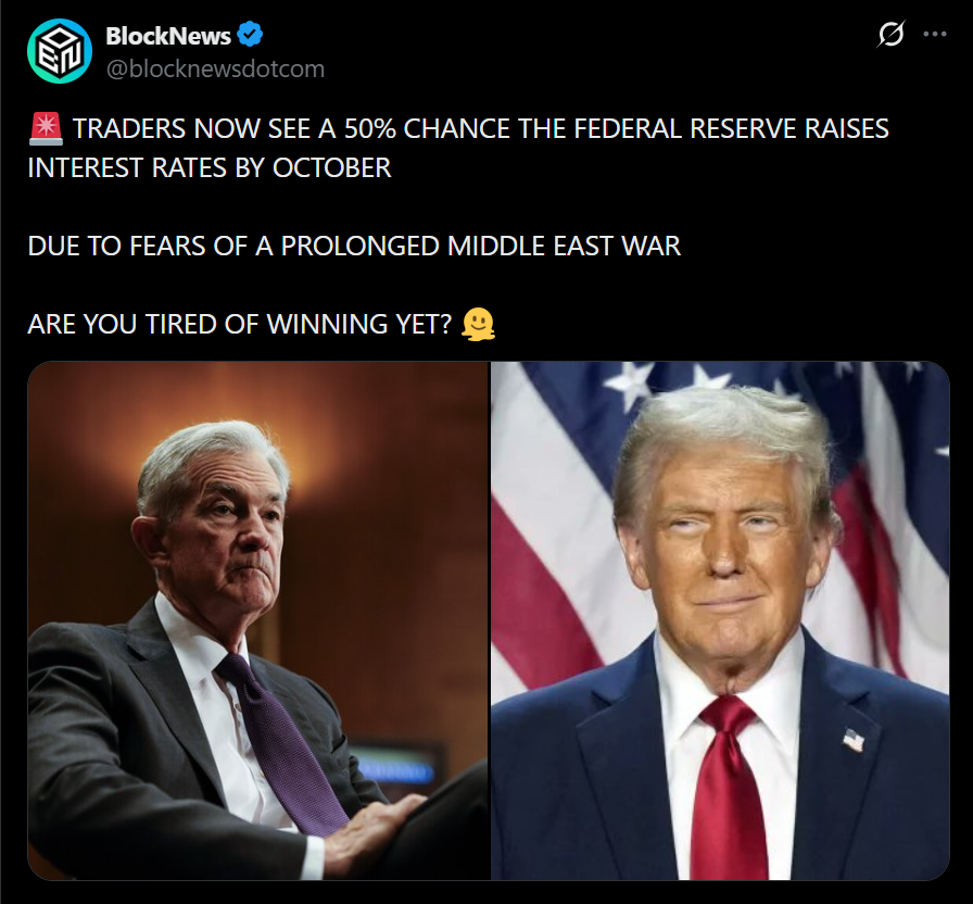 That escalation has changed expectations fast. Traders are now pricing in a 50% chance of a Federal Reserve rate hike by October, a major reversal from just weeks ago when markets were expecting rate cuts instead. It’s not just a tweak in outlook, it’s a full shift in direction, and markets are still adjusting to it.