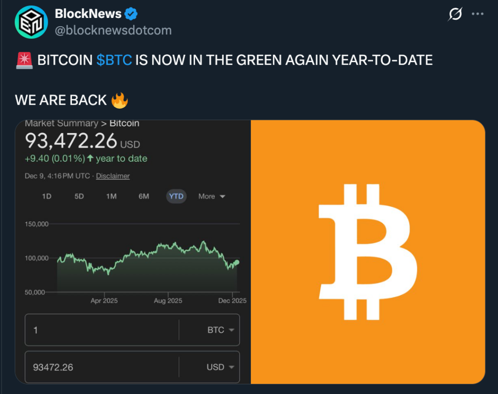 - Bitcoin flipped positive year-to-date after reclaiming $94,000.