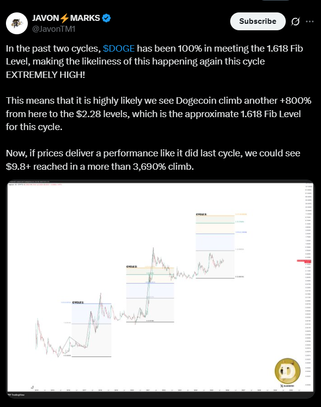 “In the past two cycles, DOGE has been 100% consistent in hitting the 1.618 Fibonacci level,” Marks noted. “This makes the probability of another 800% move extremely high. If DOGE mirrors its last performance, prices could even reach $9.80, marking a staggering 3,690% climb.”