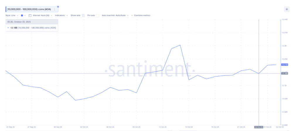 Data from Santiment shows that wallets holding between 10 million and 100 million ADA have been on a mild accumulation streak. In just two days, this group added roughly 50 million ADA, bumping their total holdings from 13.16 billion to 13.21 billion. That’s around $32.5 million worth of ADA at current prices — not a small bet.