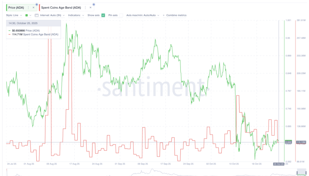 Another interesting detail comes from ADA’s dormancy metrics. The Spent Coins Age Band — which tracks how old coins move — has dropped by about 36% since mid-October, from 179 million ADA to around 114 million. In simple terms, fewer coins are moving around, meaning more holders are sitting tight instead of selling.