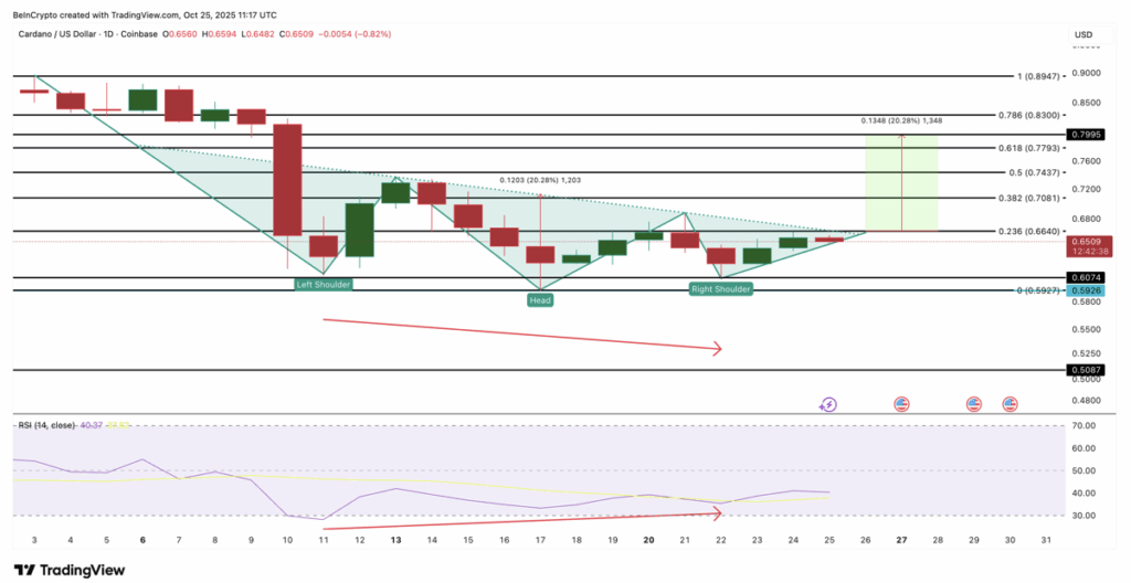 The only catch is that the neckline of the pattern is sloping downward, a sign that sellers haven’t disappeared yet. Still, ADA holding above $0.60 keeps the setup valid. If it dips below that, though, the structure collapses and support shifts down to $0.50 — a level that’s been tested several times before.