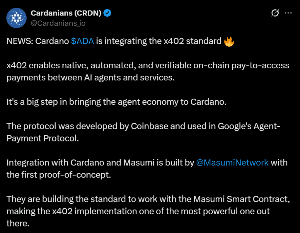 • Cardano is integrating Coinbase’s x402 payment standard to enable AI-driven onchain payments using ADA and USDM.