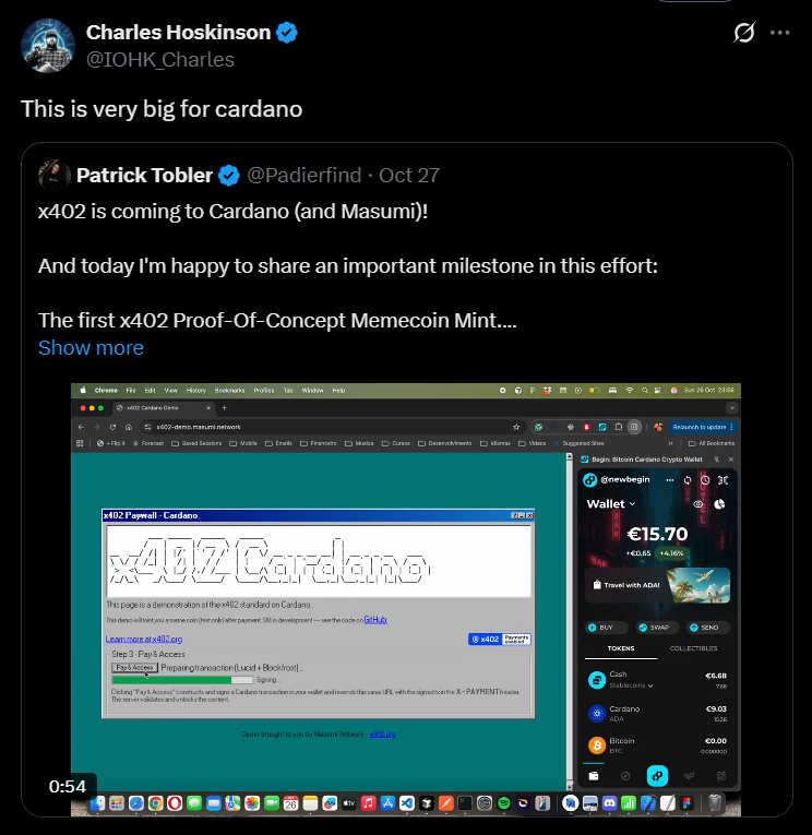 The move comes from the Masumi blockchain team, which is spearheading the integration effort. According to Cardano founder Charles Hoskinson, this milestone could be a turning point for the network’s automation and smart contract functionality. “This is very big for Cardano,” he shared on X, signaling how central AI could become to Cardano’s roadmap in 2026 and beyond.