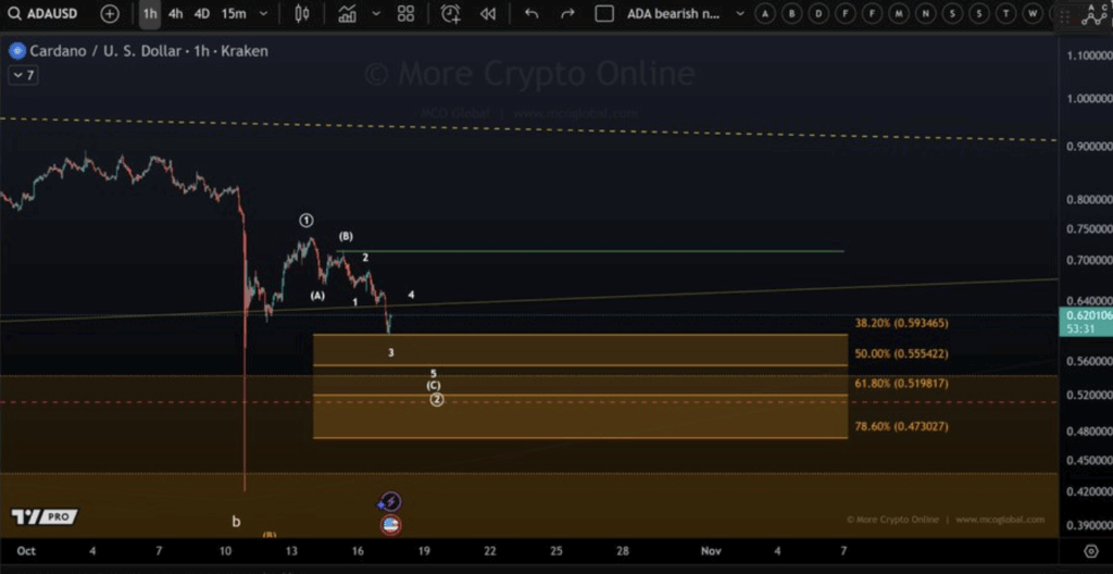 Another analyst, More Crypto Online, highlighted that ADA has now tagged the 38.2% Fibonacci retracement level from its previous rally. This point often acts as a short-term floor before buyers return. While bears still have the upper hand for now, the Fibonacci touch gives some traders hope that ADA might soon pivot upward.