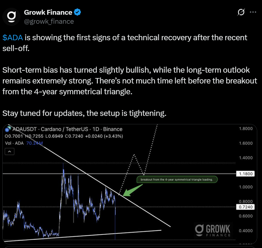 Technical charts from Growk Finance highlight that ADA is still trading within a four-year symmetrical triangle, a consolidation pattern that has historically preceded major breakouts. The current structure shows ADA repeatedly defending the $0.70–$0.72 range, confirming this zone as strong short-term support.