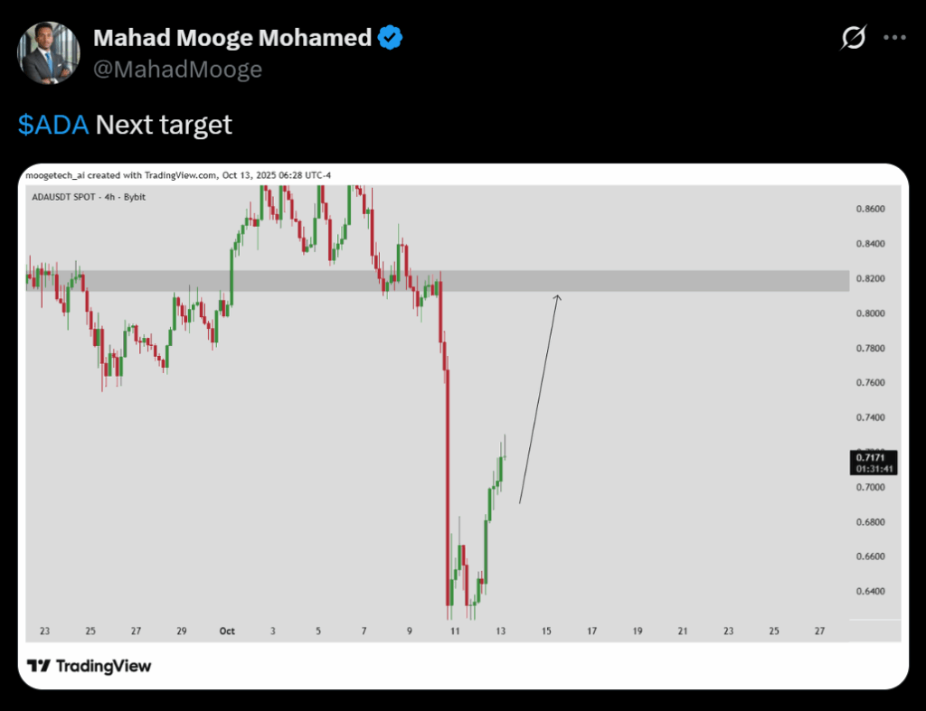 In the short term, ADA is forming a V-shaped recovery, reclaiming key price levels after briefly dipping below $0.65. Charts shared by Mahad Mooge show ADA targeting $0.82 as the next resistance zone — an area that coincides with historical supply and trading volume imbalances. If buyers manage to maintain strength above $0.70, analysts expect a move toward $0.92, which would complete a full retrace of last week’s decline.