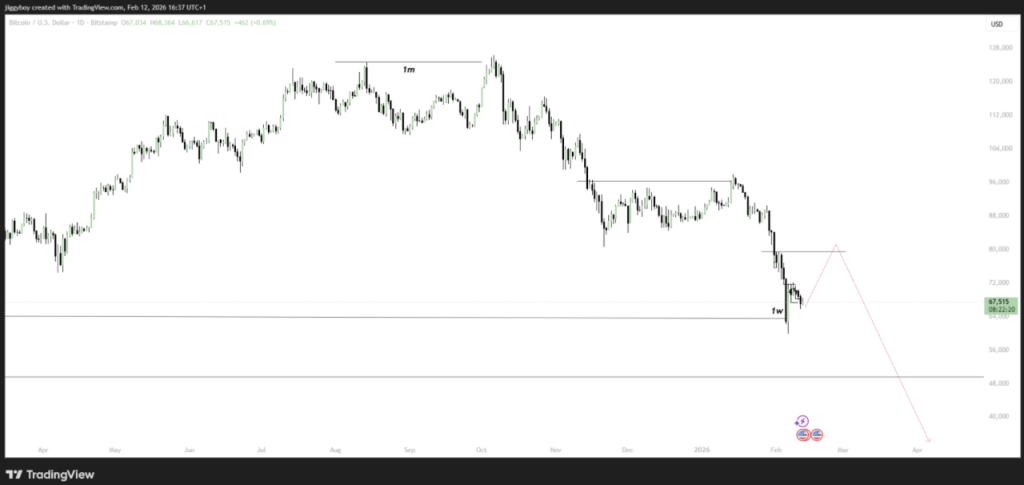 BTC has been sliding for months, and the real damage came after the early February breakdown. Bitcoin lost a major support zone and dropped sharply into the mid-$60,000s, with only a small bounce showing up so far. It’s not the kind of dip that screams “healthy pullback.” It looks more like a structural reset.