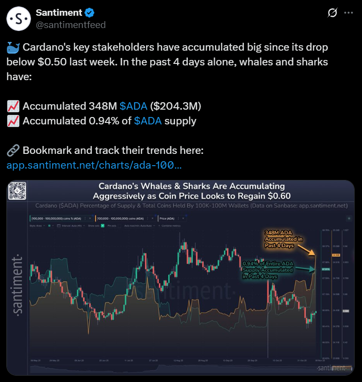 Cardano has quietly become one of the more interesting on-chain stories this week. According to data from @santimentfeed, whale and shark wallets holding between 100,000 and 100 million ADA accumulated around 348 million ADA over the last four days after price slipped below $0.50. At recent prices, that stash is worth roughly $204.3 million and represents about 0.94% of ADA’s total supply, based on Santiment’s on-chain chart.
