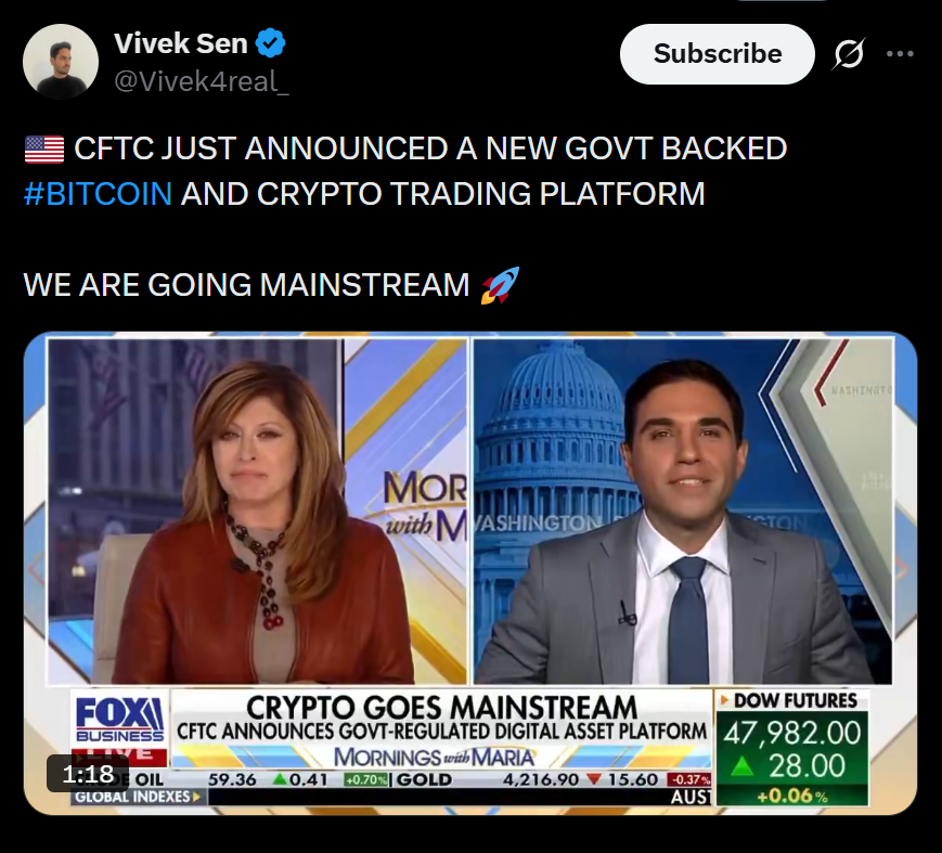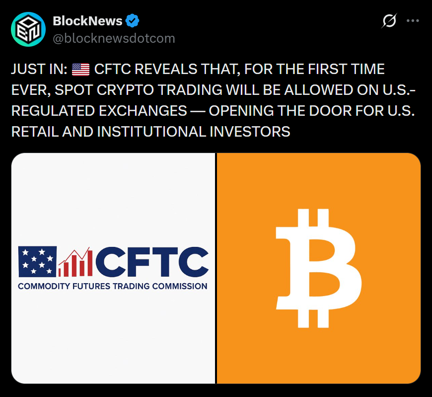 “Now, for the first time ever, spot crypto can trade on CFTC-registered exchanges… with the customer protections and market integrity that Americans deserve.”