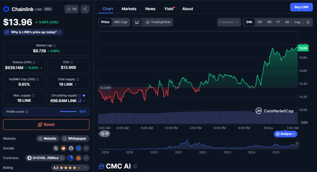 The breakout started right as LINK punched above the $13.58 resistance zone. Trading volume then exploded — up nearly 95% compared to its daily average — signaling that this wasn’t just retail noise or a brief wick. Instead, the flow suggested deliberate accumulation, with steady buying pressure pushing the token higher throughout the session.