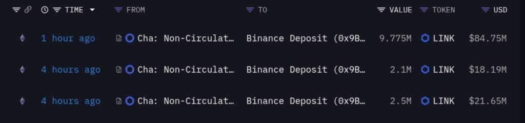Digging a bit deeper, the flow wasn’t just one massive dump. According to Arkham data, around 14.37 million LINK—worth about $124 million—was sent to Binance in chunks: 9.77 million, then 2.5 million, followed by 2.1 million. That staggered pattern feels intentional, almost careful.