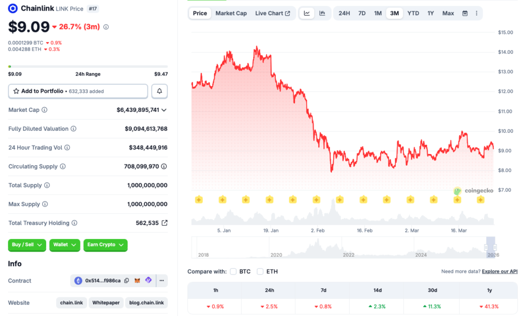 Recent price data shows a mixed picture, almost confusing at first glance. LINK is down around 2.5% in the last 24 hours and slightly down on the weekly chart, while still holding modest gains over the past two weeks and month. It’s not a strong trend in either direction, more like a pause… or maybe a setup, depending on how you look at it.