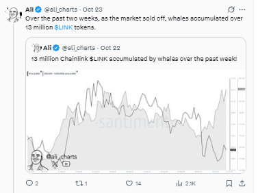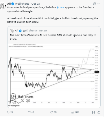 Crypto analyst Ali Martinez pointed out that LINK is currently forming a symmetrical triangle — a pattern that often precedes massive price swings. According to him, the accumulation at $17 has created a “huge support wall,” showing that buyers are stepping in aggressively. Technically, once LINK clears the $25 resistance level, the path could open for a sharp move to $53 and potentially even triple digits. It’s the kind of setup traders love — tight consolidation, strong volume, and whale accumulation building beneath the surface.