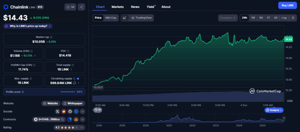 The crypto market is finally showing signs of life again, and Chainlink (LINK) is one of the altcoins catching the strongest upside momentum. With Bitcoin reclaiming $93,000, investor confidence snapped back fast, dragging large-cap assets along with it. LINK has surged nearly 19% in the last 24 hours, added 10% over the week, and posted a steady 6.5% gain across the 14-day window. Still, it’s down 11.3% in the last month and more than 42% from December 2024 levels — which means the recovery story isn’t complete yet. So the big question: can Chainlink actually reach $25 this December?