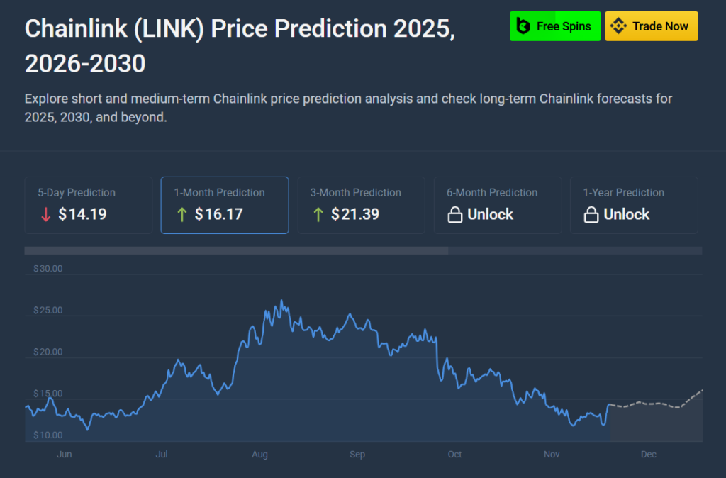 Forecasts from CoinCodex paint a more cautious picture. While they expect LINK to rally through December, their models predict a maximum price of about $15.40 by Dec. 31, far below the $25 target. That translates to roughly a 7.4% gain from current levels — respectable, but nowhere near the explosive jump needed to retest September’s highs.