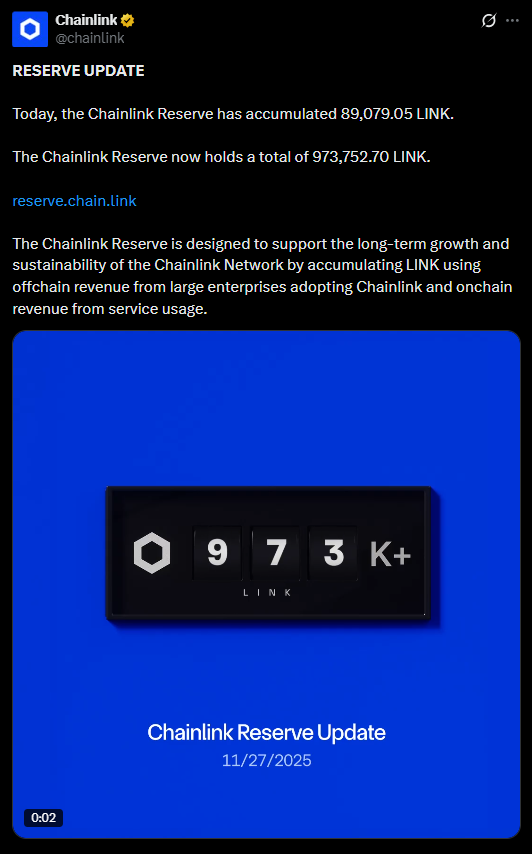 - The Chainlink Reserve has accumulated over 973,700 LINK and is close to hitting the one-million milestone.