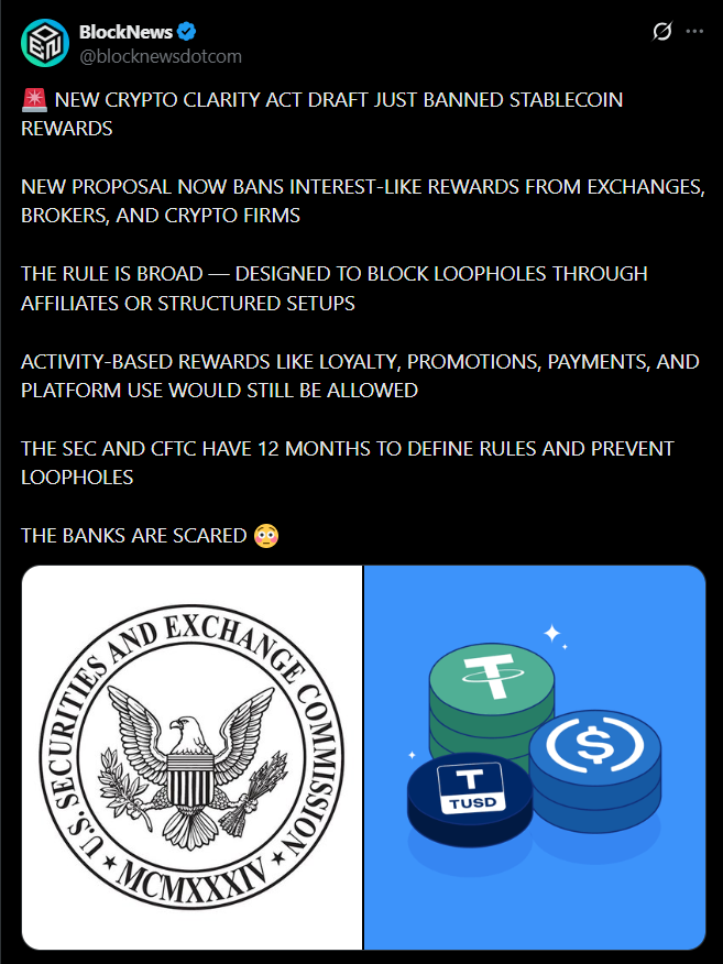 The proposed rules would prohibit issuers from offering passive rewards simply for holding stablecoins. In other words, no interest-like returns tied to balances. Activity-based rewards might still be allowed, but the framework is still unclear, and that uncertainty is enough to shake confidence.