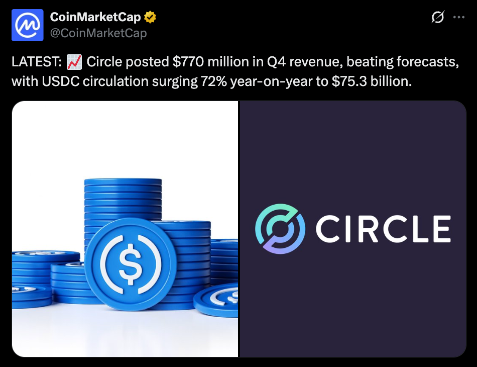 While attention centered on Bitcoin’s recent bounce, a more structural development unfolded. Circle reported earnings strong enough to send its stock sharply higher, drawing mainstream coverage and investor focus.