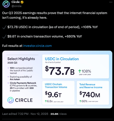- Circle’s USDC supply surged 108% year-over-year to $73.7 billion, with $214 million in Q3 net income.