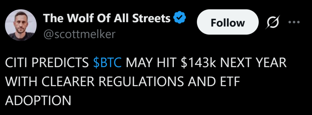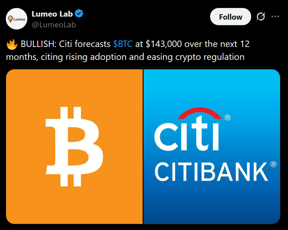 - Citi forecasts Bitcoin could reach $143K within 12 months.