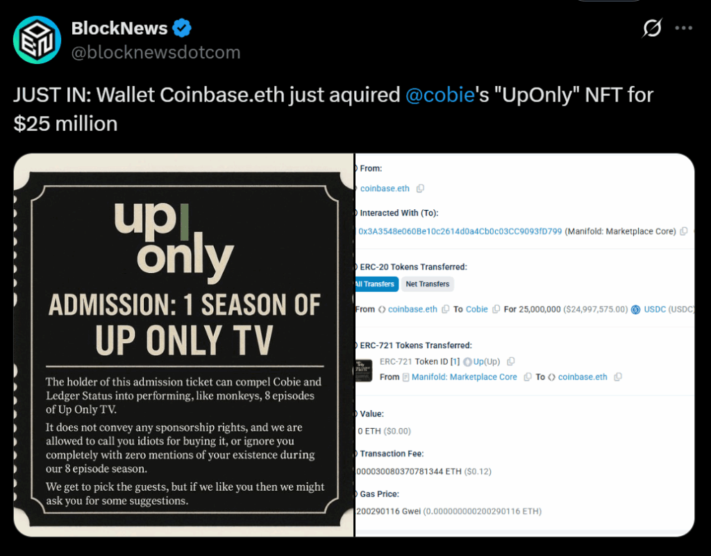 Coinbase just dropped $25 million in USDC to purchase the UpOnly NFT from crypto influencer Cobie, according to on-chain data. The NFT isn’t your typical collectible — it comes with a unique utility: the right to compel Cobie and co-host Ledger Status to produce eight new episodes of UpOnlyTV, the cult-favorite crypto talk show that defined the last bull market’s media scene.