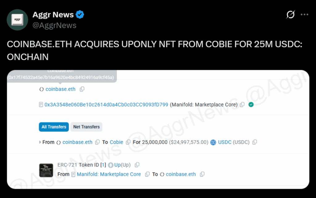 Coinbase Acquires “UpOnly” NFT From Cobie for $25 Million: Here is why