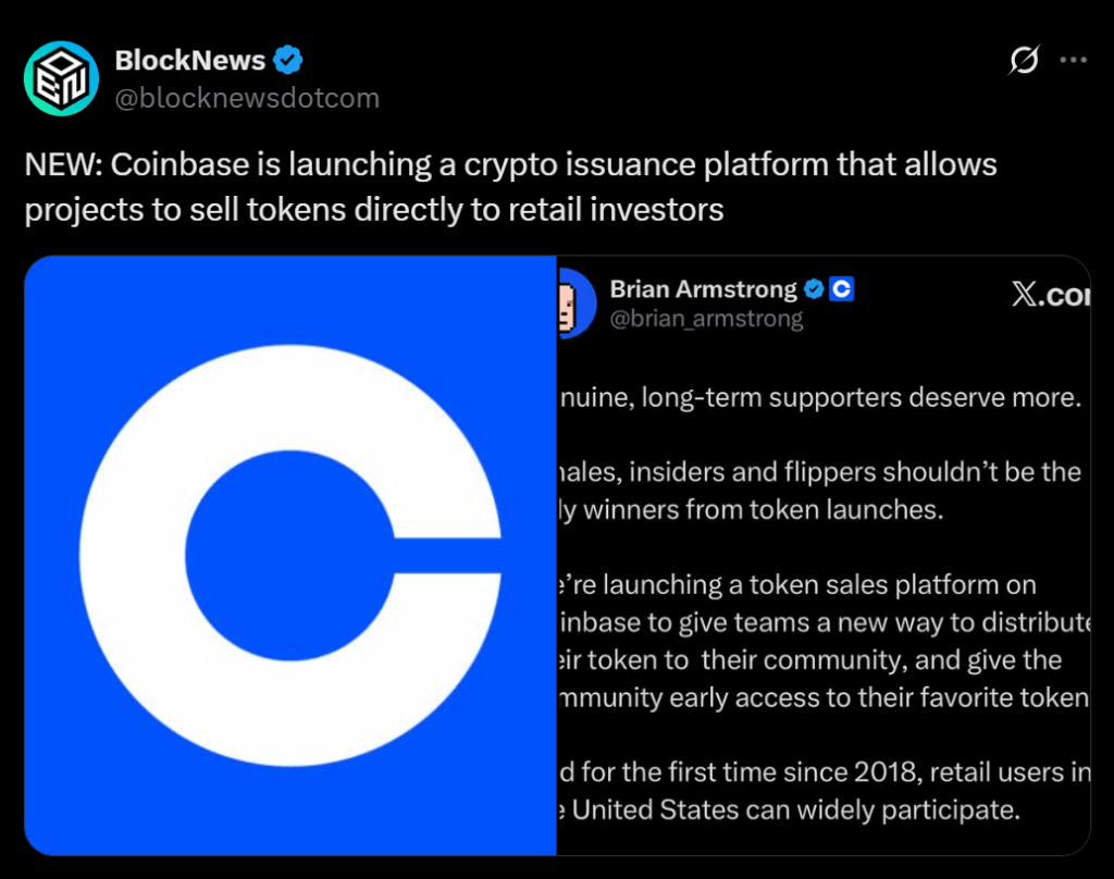 - Coinbase is launching a curated token sale platform with one sale per month and algorithmic allocation instead of first-come, first-served rushes.