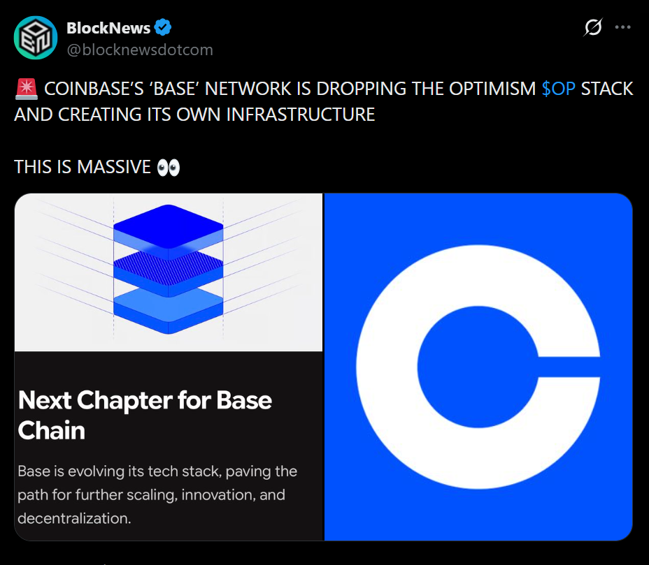 Coinbase’s layer 2 network, Base, announced it will transition away from the Optimism Stack and build what it calls a unified Base stack. That’s a significant structural change. Instead of relying on Optimism’s modular rollup framework, Base plans to develop its own proprietary infrastructure to streamline upgrades and reduce external dependencies.