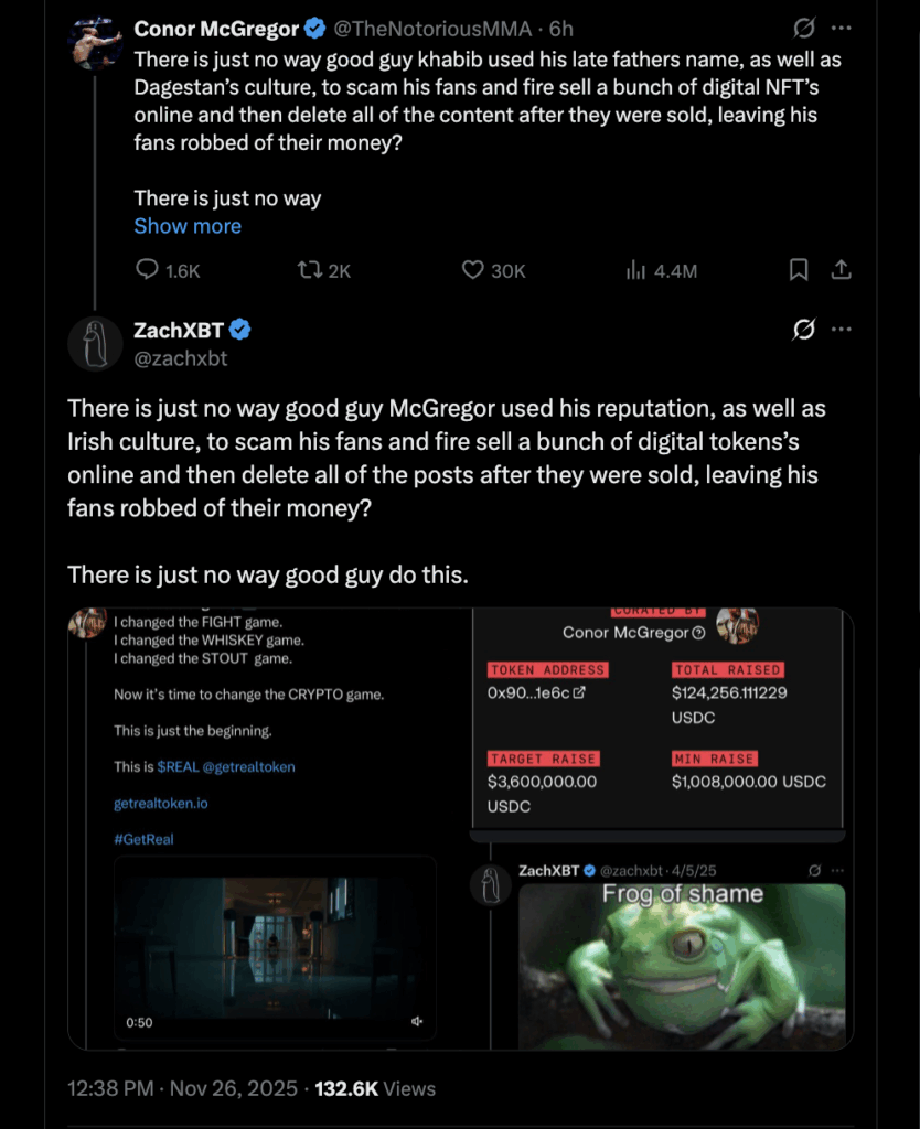 Blockchain investigator ZachXBT stepped in almost immediately, reminding McGregor that he had launched his own celebrity memecoin, REAL, earlier this year. The token never made it off the ground and managed to raise only around 39% of its target during a sealed-bid auction that was meant to prevent bots from sniping the launch. ZachXBT pointed out the irony, noting that McGregor himself wiped posts and abandoned the project once things went sideways. According to McGregor, funds were refunded, but sentiment around the launch still left a sour taste.