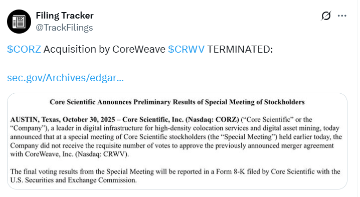 In a surprising twist, Core Scientific’s shareholders just voted down a massive $9 billion all-stock merger with CoreWeave, ending what could’ve been one of the biggest blockchain–AI deals of 2025. The vote, held on October 30, marks a rare moment of pushback in a year packed with crypto mergers and SPAC deals. Even more interesting — instead of crashing, Core Scientific’s stock actually jumped over 5% after the rejection, trading around $21.99, higher than the proposed buyout price of $20.40 per share.