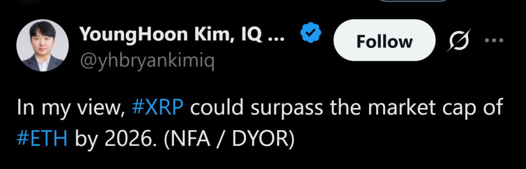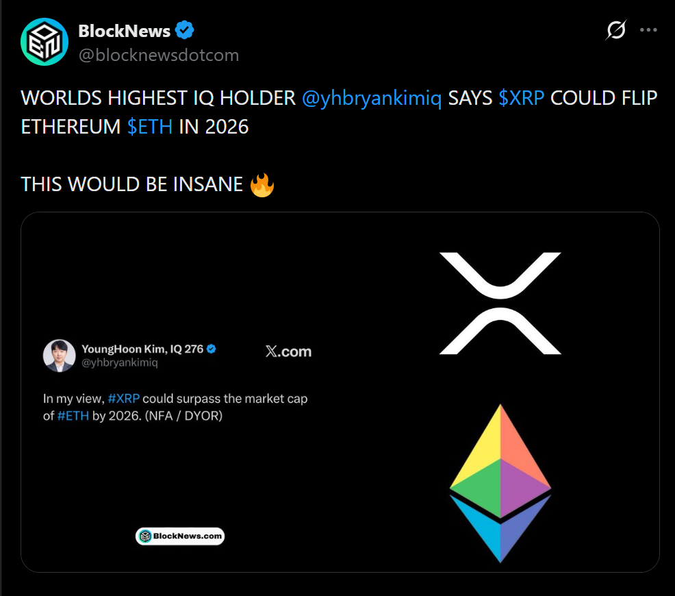 A bold claim is making the rounds in crypto circles after YoungHoon Kim, who publicly states he has an IQ of 276, suggested that XRP could overtake Ethereum’s market capitalization by 2026. In a social media post, Kim clarified that the comment reflected his personal view rather than financial advice, but the statement quickly sparked discussion. The idea of XRP challenging Ethereum’s long-held second-place position is controversial, though not entirely new.