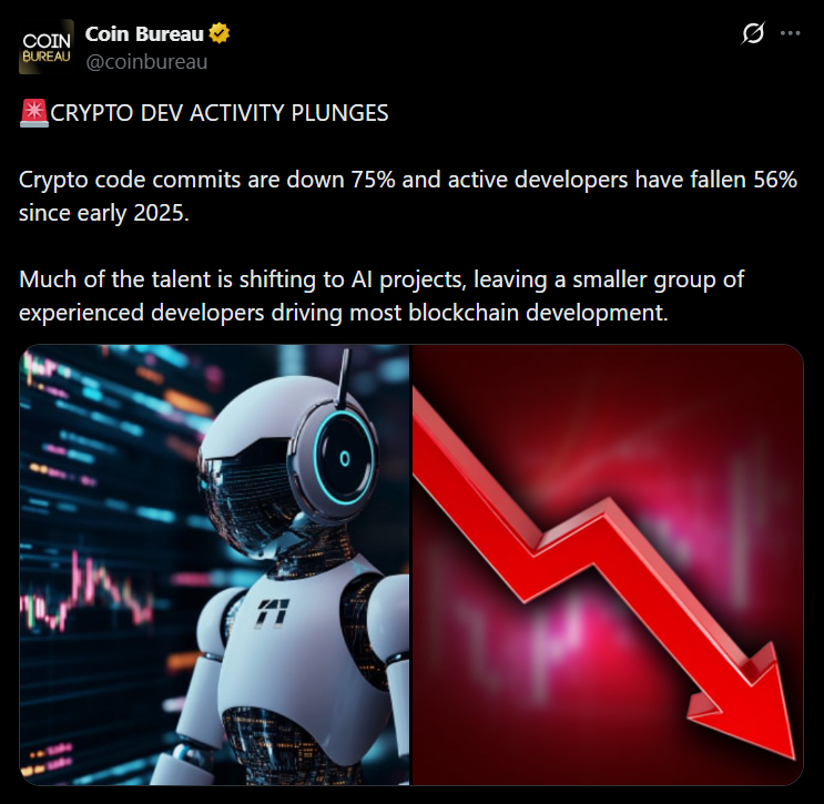 • Crypto developer activity has dropped sharply while AI hiring surges