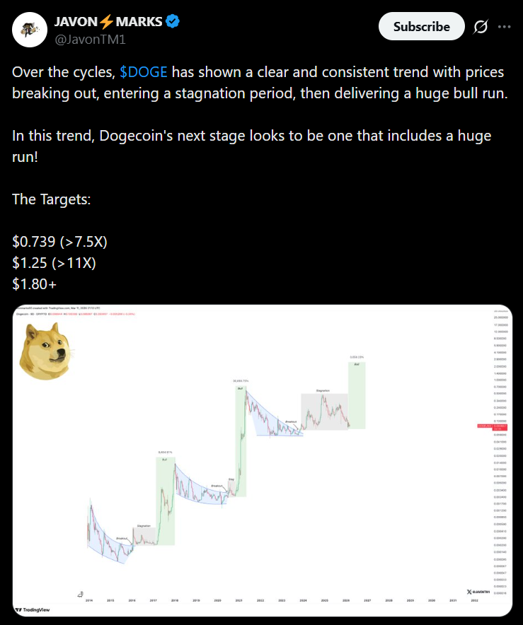 Despite the weak price performance, some analysts believe Dogecoin could eventually stage another significant rally. Crypto analyst Javon Marks recently pointed out a recurring pattern in Dogecoin’s historical price cycles.