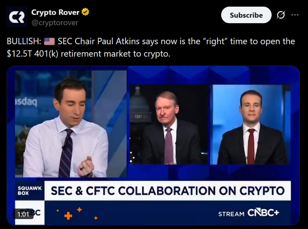 SEC Chair Paul Atkins has publicly backed the idea of allowing crypto exposure inside 401(k) retirement plans, as long as it’s done carefully and under professional management. This marks a notable shift in tone from years of regulatory skepticism. Rather than framing crypto as an all-or-nothing risk, Atkins positioned it alongside private equity and other alternative assets that Americans already access indirectly through pensions.