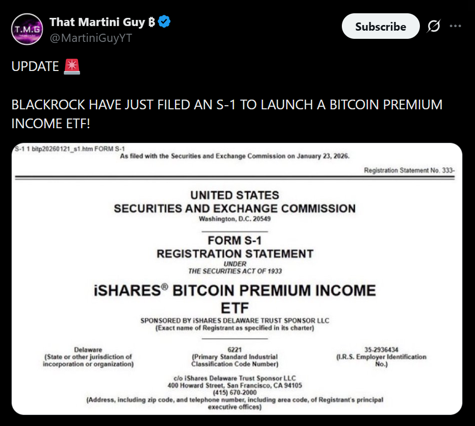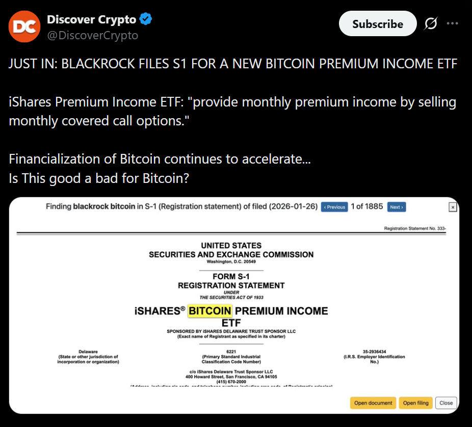 • BlackRock filed for a Bitcoin-linked income ETF using a covered call strategy