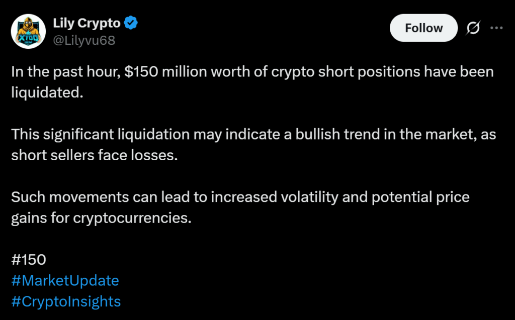 - Over $160M in crypto shorts liquidated within an hour amid rising prices.