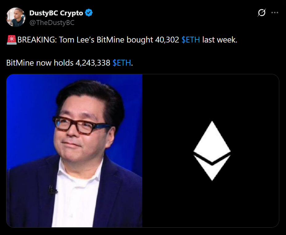 Bitmine Immersion Technologies has expanded its Ethereum holdings to approximately 4.2 million ETH, valued at more than $12 billion, following another major weekly acquisition. The company has not skipped a single week of ETH accumulation since outlining its long-term strategy, signaling a deliberate and disciplined approach rather than opportunistic buying.