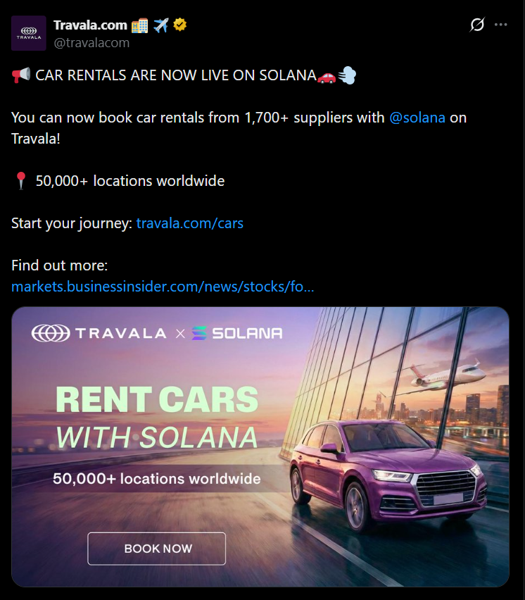 Flights, hotels, activities — and now car rentals. All integrated into a system where crypto payments actually function as intended.